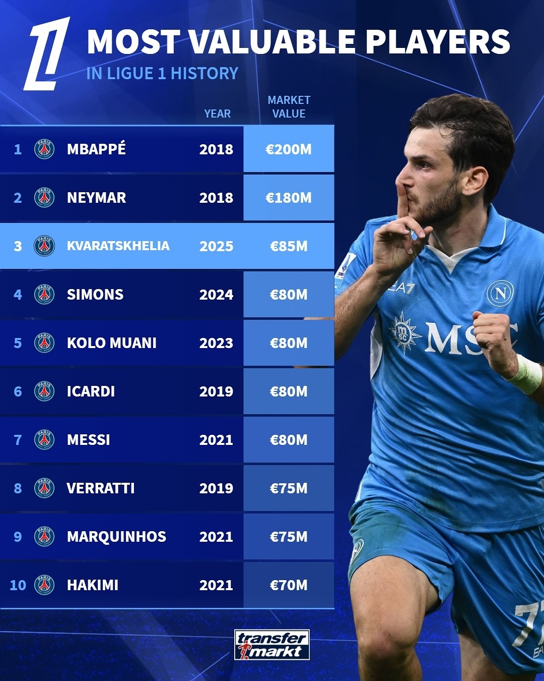 1月18日訊 官方消息,巴黎圣日耳曼從那不勒斯引進(jìn)邊鋒克瓦拉茨赫利亞,雙方簽約至2029年。據(jù)羅馬諾報(bào)道,這筆交易的轉(zhuǎn)會(huì)費(fèi)超過(guò)7000萬(wàn)歐。德轉(zhuǎn)也在社媒發(fā)布了法甲歷史前10身價(jià)的球員排行榜,前十均是巴黎圣日耳曼球員。