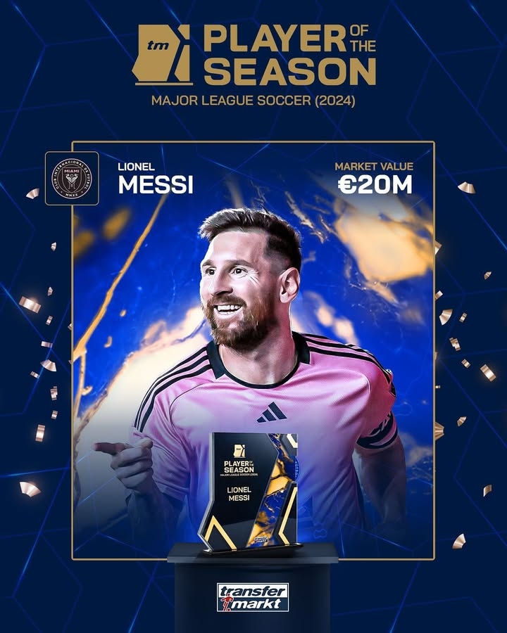 德國轉(zhuǎn)會市場官方社媒曬出為梅西制作的海報,宣布他當(dāng)選德轉(zhuǎn)美職聯(lián)2024賽季最佳球員。
