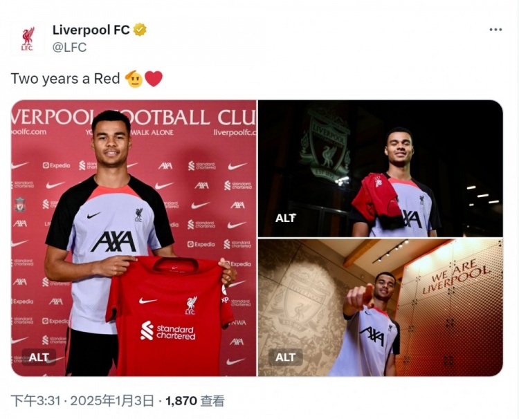 利物浦官方社媒曬出加克波加盟時的照片,并配文:“成為紅軍兩周年。”
