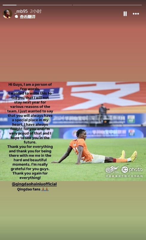 1月3日訊 今天,博阿基耶更新社媒,宣布自己將離開青島海牛。