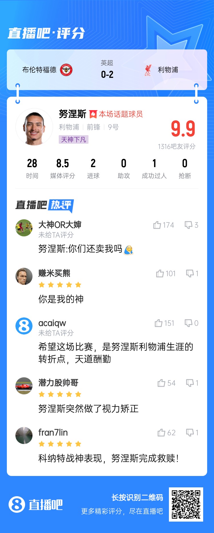 發(fā)布時間:2025年01月19日 02:31點擊:欄目:足球新聞 除特別注明外,本站所有內(nèi)容均為九球直播整理排版,轉(zhuǎn)載請注明出處:終于不斜眼了!吧友給補時雙響的努涅斯評出罕見的9.9超高分 本文標簽: 足球 英超 利物浦