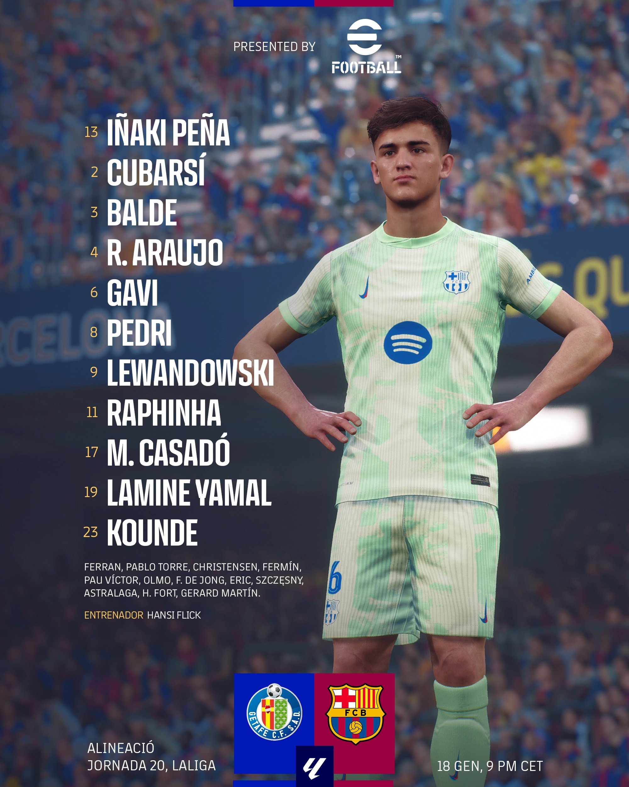 巴薩首發(fā):13-佩尼亞、23-孔德、2-庫巴西、4-阿勞霍、3-巴爾德、17-卡薩多、6-加維、8-佩德里、11-拉菲尼亞、19-亞馬爾、9-萊萬