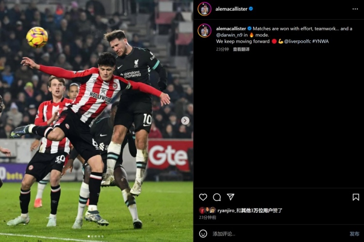 麥卡利斯特寫道:通過努力和團隊合作贏下了比賽,當然也要靠火力全開的努涅斯。我們會繼續(xù)努力
