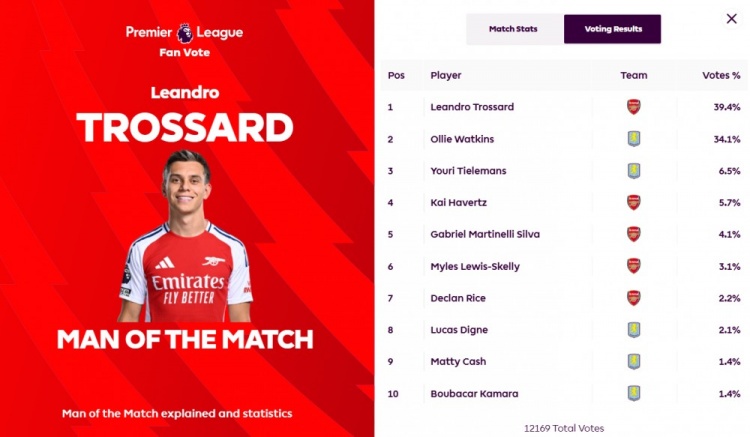 發(fā)布時(shí)間:2025年01月19日 04:50點(diǎn)擊:欄目:足球新聞 1月19日訊 本輪英超比賽,阿森納2-2維拉。賽后,英超官網(wǎng)宣布,特羅薩德當(dāng)選全場(chǎng)最佳球員。特羅薩德本場(chǎng)比賽送出2次助攻,獲得了39.4%得票率。 除特別注明外,本站所有內(nèi)容均為九球直播整理排版,轉(zhuǎn)載請(qǐng)注明出處:英超官方:特羅薩德當(dāng)選阿森納2-2維拉全場(chǎng)最佳球員 本文標(biāo)簽: 足球 英超 阿森納 阿斯頓維拉