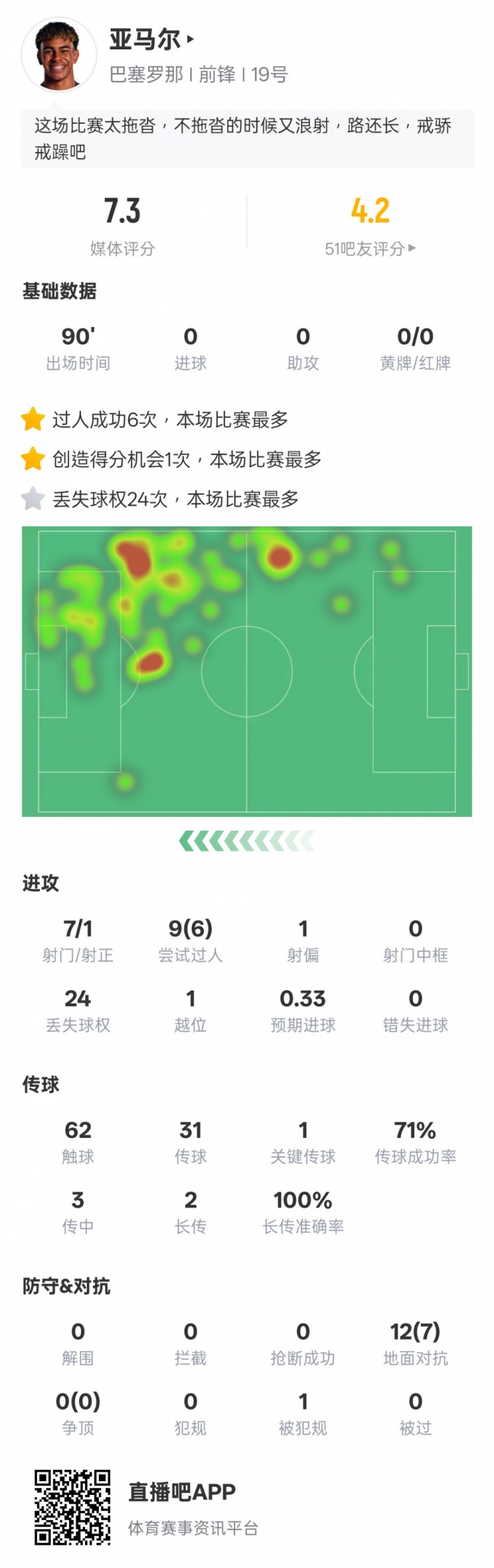 亞馬爾本場比賽數(shù)據(jù)如下: