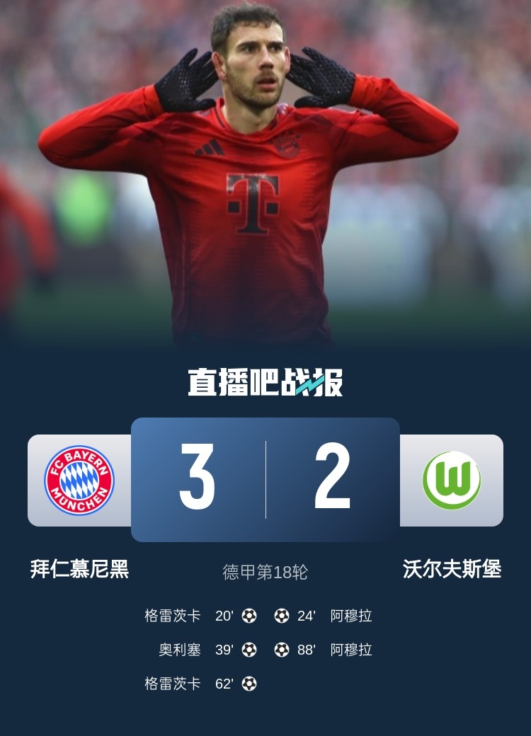 德甲第18輪,拜仁3-2沃爾夫斯堡,格雷茨卡梅開二度,奧利塞進球。