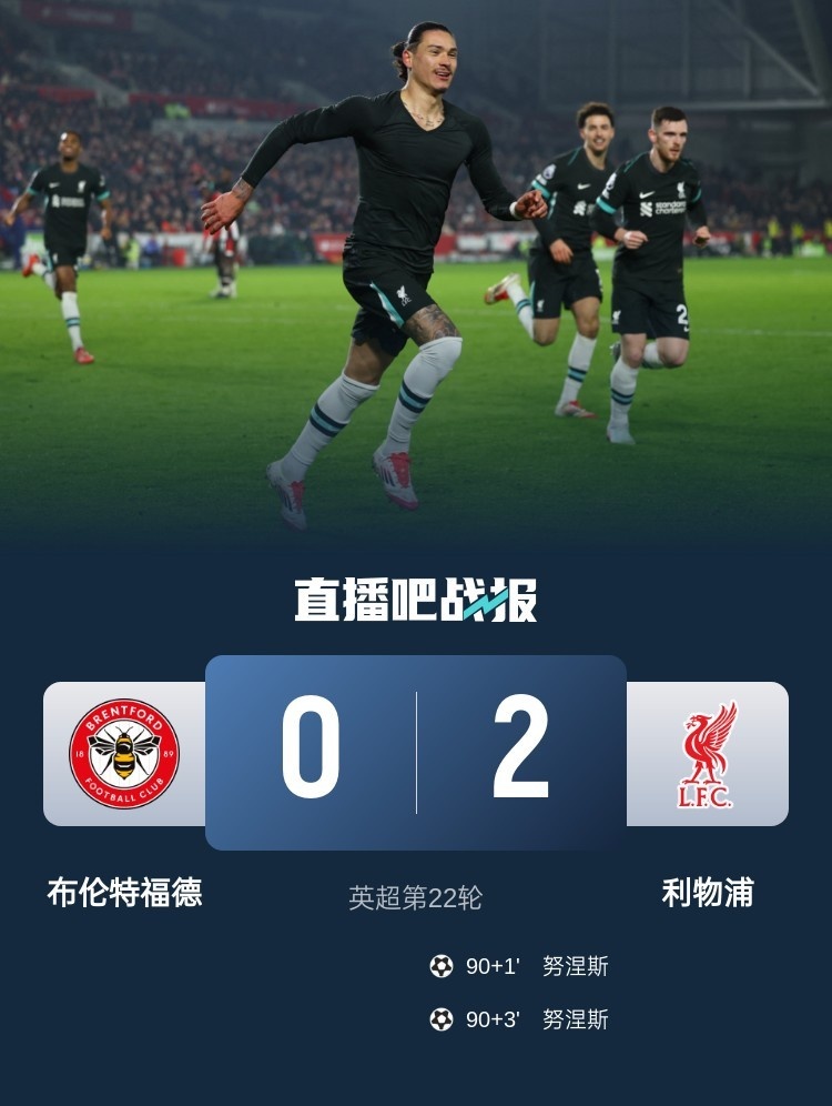 英超第22輪,利物浦客場2-0布倫特福德,努涅斯補時連進兩球。