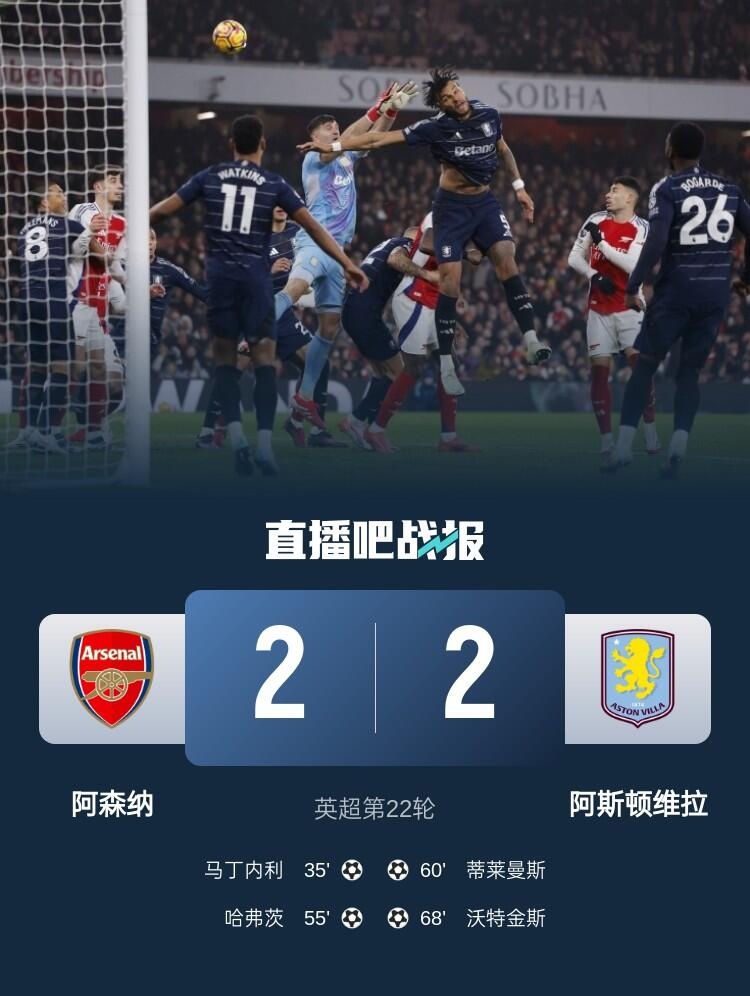 英超第22輪,阿森納2-2戰(zhàn)平阿斯頓維拉,馬丁內(nèi)利、哈弗茨破門。