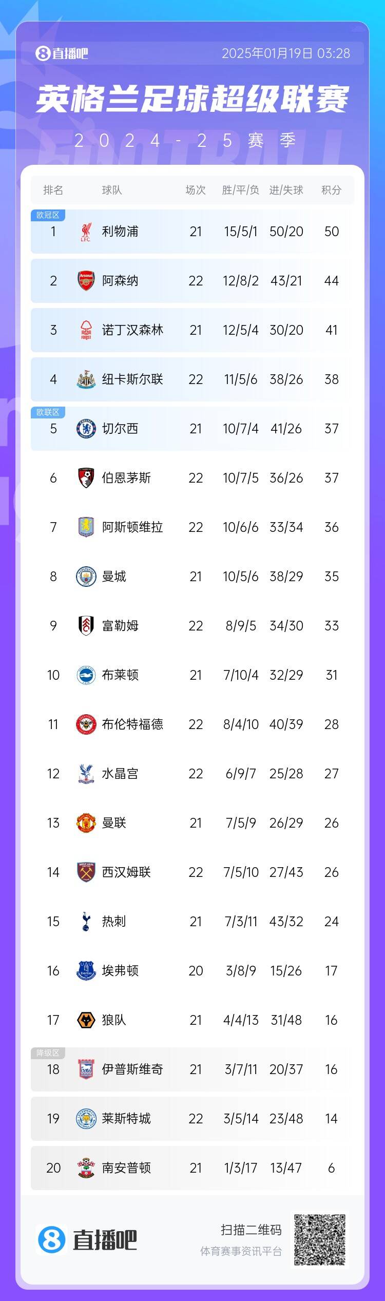 英超積分榜:利物浦少賽6分領(lǐng)跑 阿森納暫居第2、維拉超曼城升第7