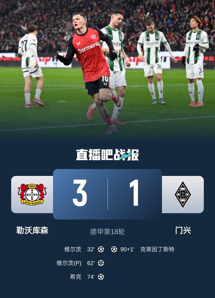 德甲第18輪,勒沃庫森3-1門興,維爾茨梅開二度,??诉M球。