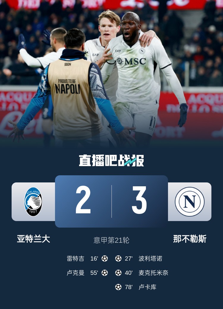 意甲第21輪,那不勒斯客場3-2逆轉(zhuǎn)亞特蘭大,盧卡庫制勝。