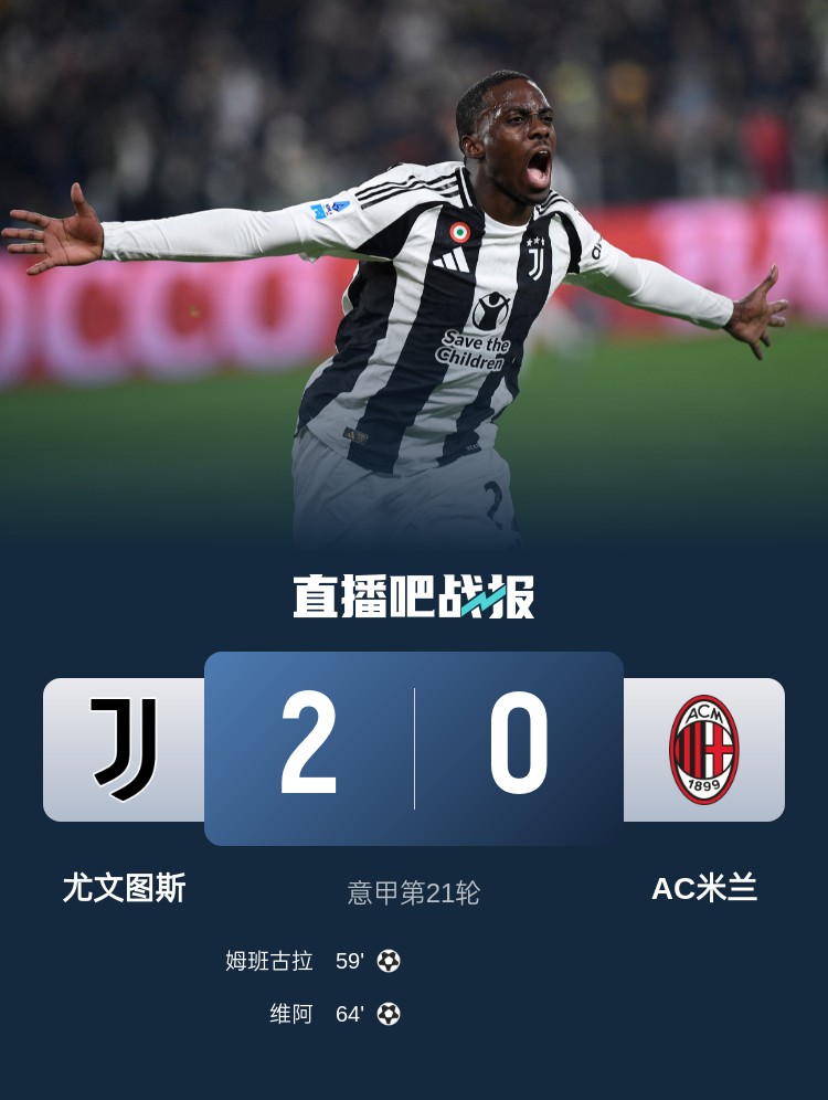 意甲第21輪,尤文2-0戰(zhàn)勝AC米蘭,姆班古拉破門,維阿建功。