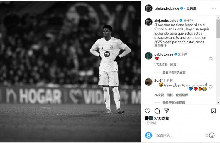 賽后巴爾德在社交媒體上寫道:“種族主義在足球和生活中都不該有立足之地,我們必須繼續(xù)斗爭,讓這些行為消失。遺憾的是,這些事情2025年還在發(fā)生?!?/p>