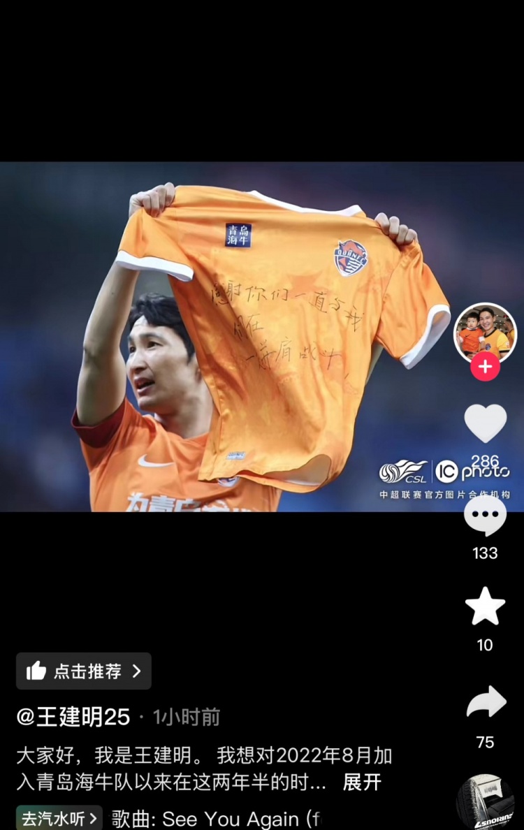 1月19日訊 今天一早,王建明在社媒發(fā)表了一封告別信和視頻,向青島海牛俱樂部及球迷告別。