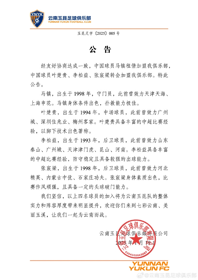 經(jīng)友好協(xié)商達(dá)成一致,中國球員馬鎮(zhèn)租借加盟我俱樂部,中國球員葉楚貴、李松益、張宸梁轉(zhuǎn)會(huì)加盟我俱樂部。特此公告。