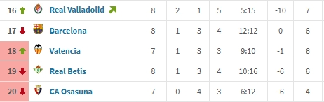 最近8輪戰(zhàn)績糟糕的巴薩,僅僅比奧薩蘇納的4分更高,與瓦倫西亞和貝蒂斯同分,因凈勝球優(yōu)勢列前。其中瓦倫西亞和奧薩蘇納還少賽一場。巴薩近期的戰(zhàn)績毫無疑問是“保級隊”的水平。