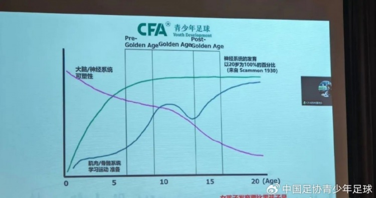 他分享了青少年足球發(fā)展的一個(gè)曲線圖,圖例包含三條曲線:大腦/神經(jīng)系統(tǒng)的可塑性,從0歲到20歲持續(xù)下降;對(duì)應(yīng)的是神經(jīng)系統(tǒng)的發(fā)育,在0歲到10歲是快速上升階段,10歲到20歲為緩慢增長(zhǎng)并趨于穩(wěn)定;肌肉/骨骼系統(tǒng)生長(zhǎng)和學(xué)習(xí)運(yùn)動(dòng)的能力,0歲到10歲快速上升,隨后有所反復(fù),15歲后逐步上升。他給出了各年齡段身體、技術(shù)、戰(zhàn)術(shù)和對(duì)抗的發(fā)展路徑,即0歲到11歲時(shí)導(dǎo)入期,12歲到15歲是貫徹基礎(chǔ)要素期,16歲到17歲是獨(dú)立期,18歲后是完成期。