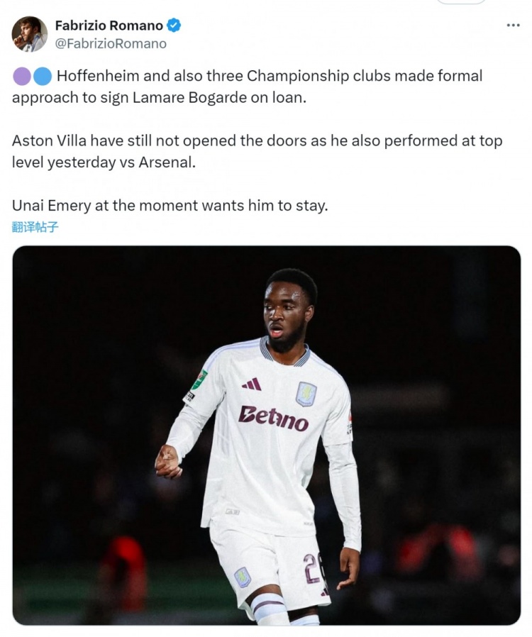 羅馬諾指出,霍芬海姆和三家英冠俱樂部對博加德感興趣,已經(jīng)就租借球員與維拉正式接洽,博加德在對陣阿森納的比賽中展現(xiàn)出頂級水準,維拉沒有為他的離隊打開大門,埃梅里目前希望留住這位后防小將。