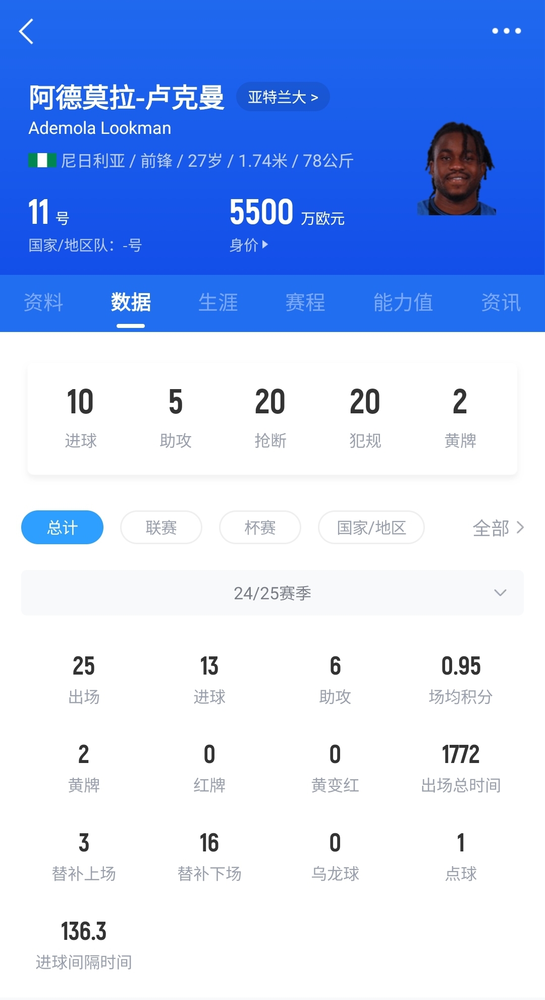 本賽季至今,27歲的盧克曼代表亞特蘭大出戰(zhàn)25場比賽,貢獻(xiàn)13球6助,球員德轉(zhuǎn)身價(jià)漲至5500萬歐,創(chuàng)個人生涯新高。