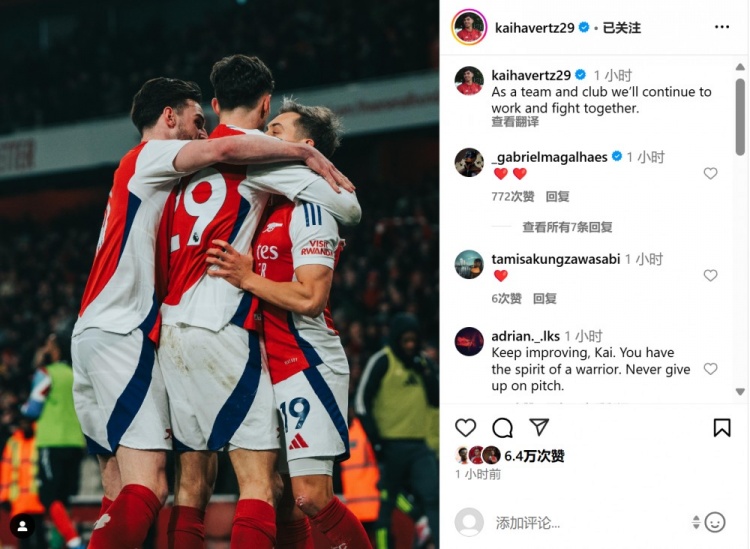 哈弗茨在個(gè)人社媒曬出與隊(duì)友慶祝進(jìn)球的照片,配文鼓勵(lì)道:“我們整個(gè)球隊(duì)將會(huì)繼續(xù)努力并且團(tuán)結(jié)一致!”