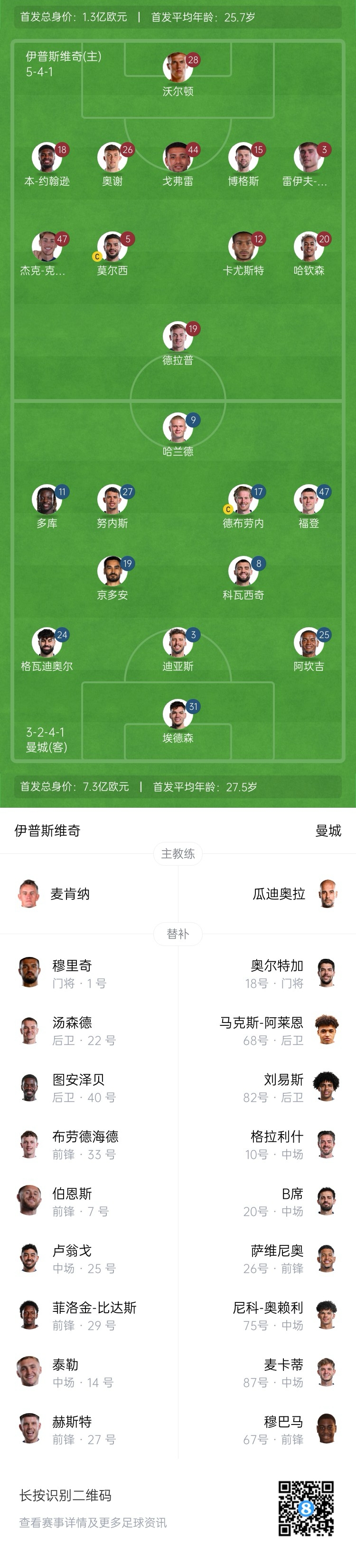 曼城替補(bǔ):18-奧爾特加、82-劉易斯、10-格拉利什、20-B席、26-薩維尼奧、67-穆巴馬、75-奧賴?yán)?7-麥卡蒂、68-艾利恩