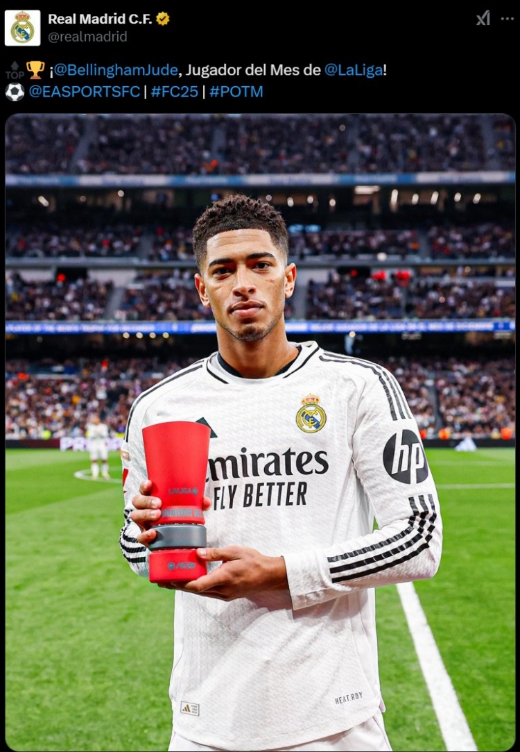 在12月份的5場(chǎng)西甲聯(lián)賽中,貝林厄姆打進(jìn)4球并有2次助攻,當(dāng)選西甲官方評(píng)選出的月最佳球員。