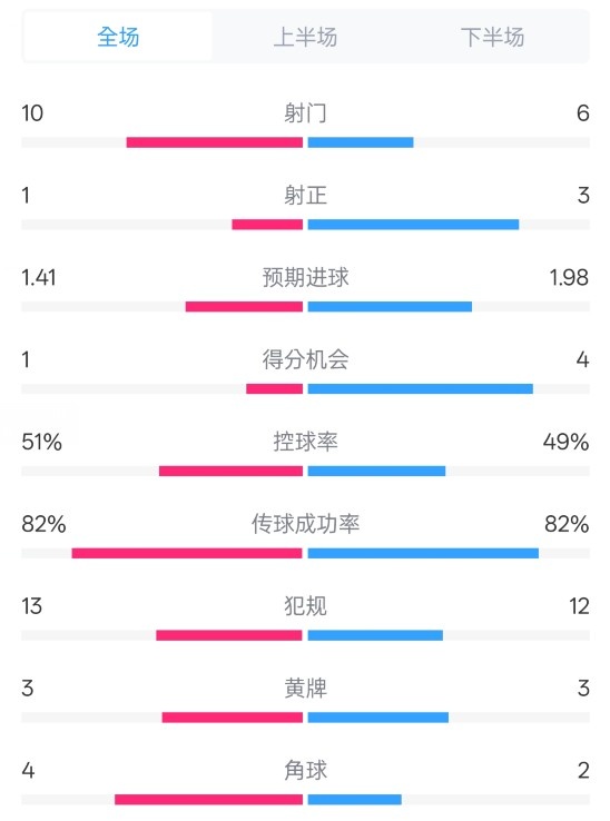 發(fā)布時間:2025年01月20日 00:50點擊:欄目:足球新聞 1月20日訊 2024-25賽季英超聯(lián)賽第22輪,曼聯(lián)1-3不敵布萊頓。全場比賽數(shù)據(jù)如下(曼聯(lián)在前):射門10-6射正1-3預期進球1.41-1.98進球機會1-4控球率51%-49%傳球成功率82%-82%犯規(guī)13-12黃牌3-3角球4-2 除特別注明外,本站所有內容均為九球直播整理排版,轉載請注明出處:曼聯(lián)1-3布萊頓數(shù)據(jù):射門10-6,射正1-3,控球率51%-49% 本文標簽: 足球 英超 曼聯(lián) 布萊頓