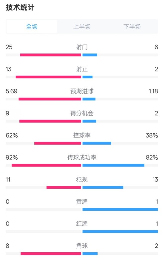 發(fā)布時間:2025年01月20日 01:50點擊:欄目:足球新聞 1月20日訊 西甲第20輪,皇馬主場4-1戰(zhàn)勝拉斯帕爾馬斯。全場比賽數(shù)據(jù)如下(皇馬在前):射門25-6射正13-2預期進球5.69-1.18進球機會9-2控球率62%-38%傳球成功率92%-82%犯規(guī)11-13黃牌0-1紅牌0-1角球8-2 除特別注明外,本站所有內(nèi)容均為九球直播整理排版,轉(zhuǎn)載請注明出處:皇馬4-1拉斯帕爾馬斯數(shù)據(jù):射門25-6,射正13-2,控球率62%-38% 本文標簽: 足球 西甲 皇家馬德里 拉斯帕爾馬斯