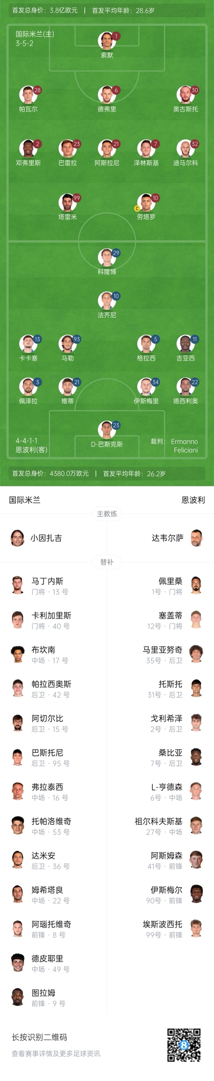 1月20日訊 意甲第21輪,國際米蘭主場迎戰(zhàn)恩波利,賽前首發(fā)名單公布。