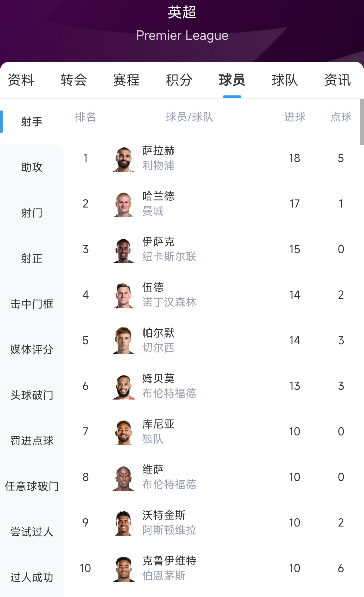 射手榜方面,薩拉赫18球領(lǐng)跑,哈蘭德17球第二,伊薩克15球第三。