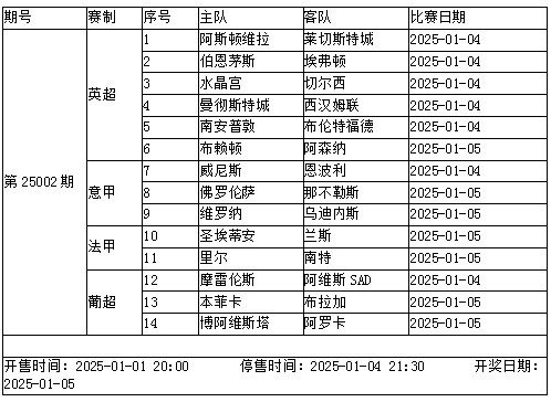 走過短暫的圣誕假期,各大足球聯(lián)賽硝煙再起。傳足勝負彩第25002期競猜對象為英超、意甲、法甲和葡超賽事,其中不乏豪門:切爾西和阿森納將分別客場對陣水晶宮和布賴頓,曼城主場迎來西漢姆聯(lián)的挑戰(zhàn),佛羅倫薩則將于那不勒斯展開對決。