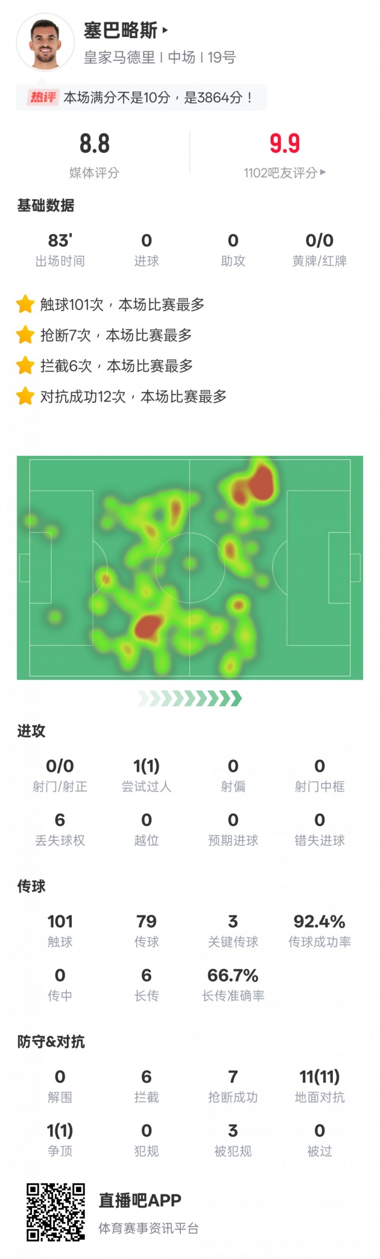 1月20日訊 西甲第20輪,皇馬4-1拉斯帕爾馬斯。本場比賽,塞巴略斯首發(fā)出戰(zhàn),送出3次關(guān)鍵傳球,還有7次搶斷和6次攔截均是全場最多,12次對抗均成功,評分8.8。