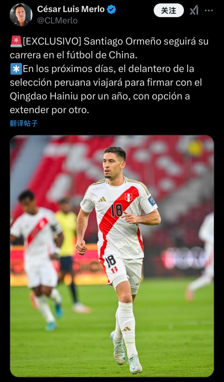 1月20日訊 據(jù)阿根廷記者梅洛報(bào)道,1米87的高中鋒、秘魯現(xiàn)役國(guó)腳圣地亞哥-奧梅尼奧將加盟青島海牛,雙方將簽訂一份年限為“1+1”的工作合同。