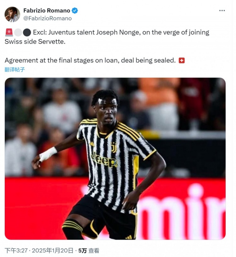 1月20日訊 據(jù)知名記者羅馬諾透露,尤文19歲中場(chǎng)博恩德(Joseph Nonge Boende)接近加盟瑞士俱樂(lè)部塞爾維特。