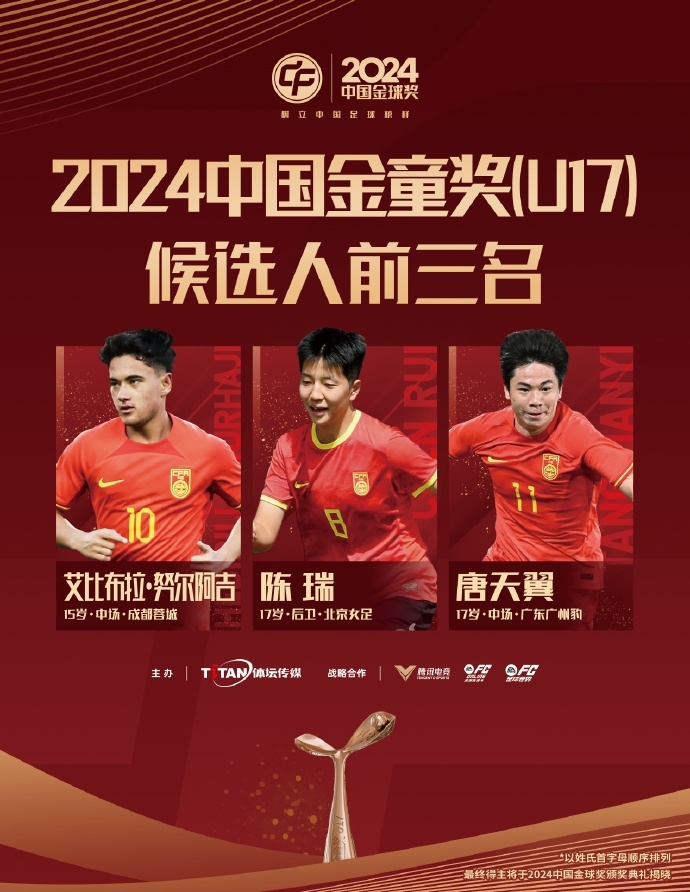 此前,在2024年中國(guó)金球獎(jiǎng)評(píng)選中,剛滿18歲的唐天翼入圍U17組金童前三候選,頒獎(jiǎng)儀式將于今年2月13日在杭州舉行。
