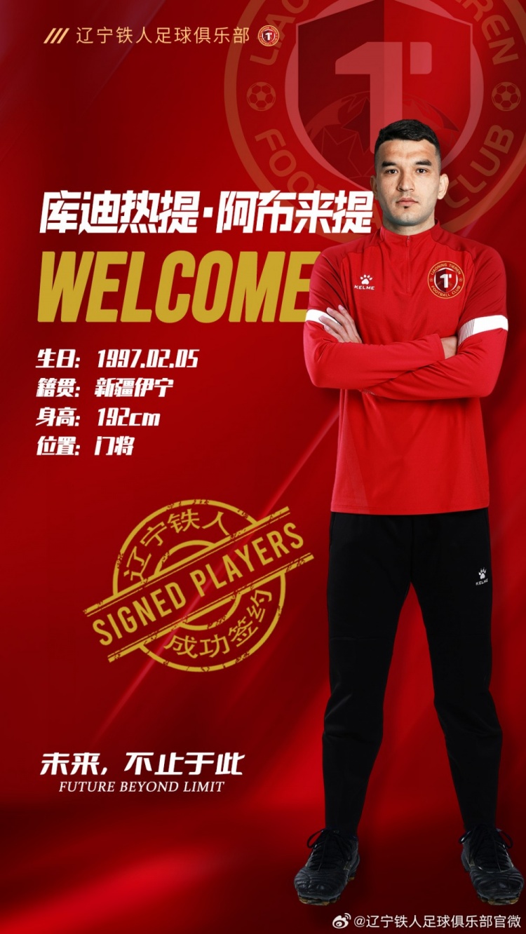 1月20日訊 中甲球隊(duì)遼寧鐵人俱樂部官方宣布,重慶銅梁龍門將庫迪熱提-阿布來提正式加盟。