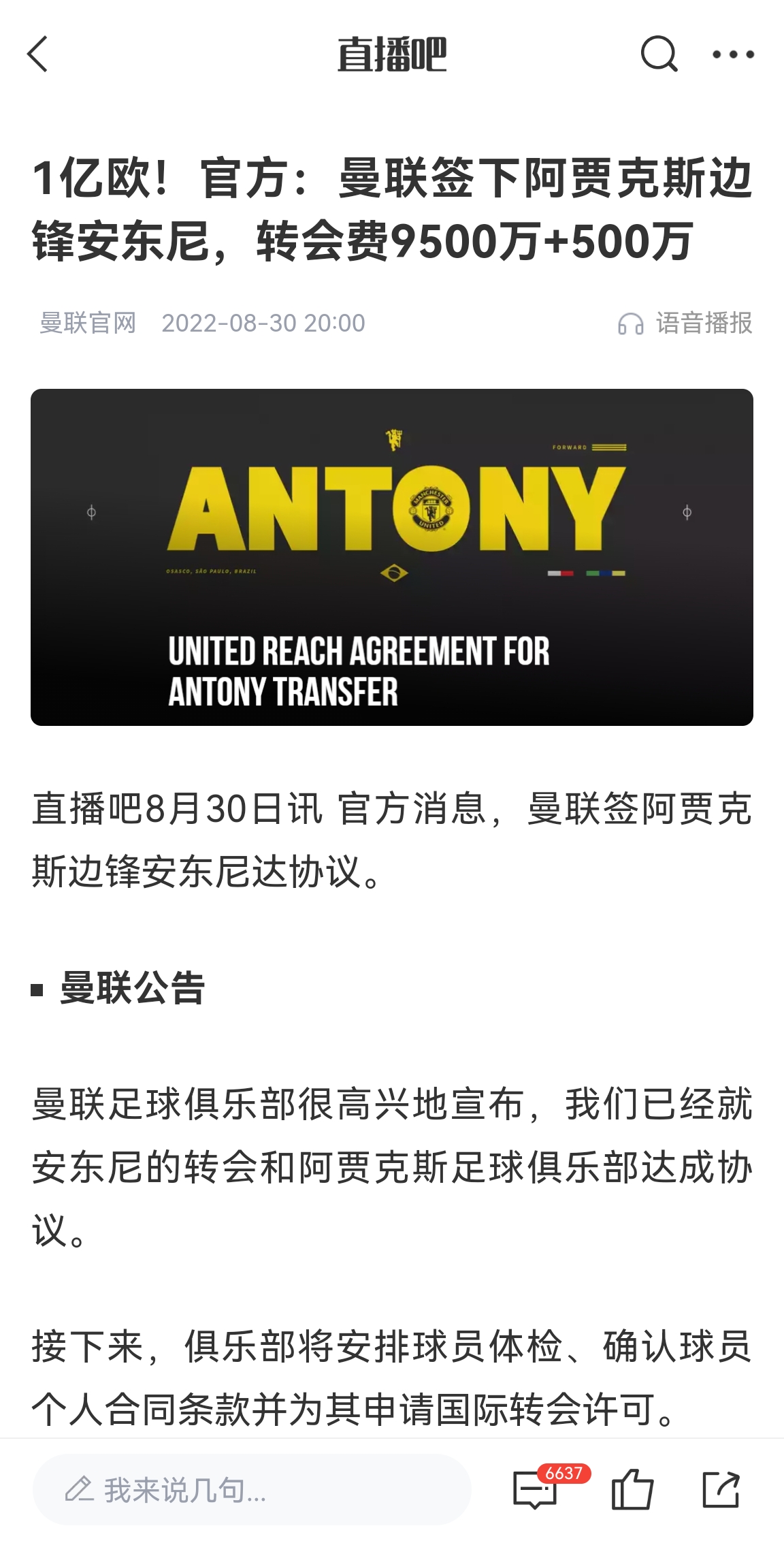 最終曼聯(lián)一路加價,據(jù)阿賈克斯官方公告透露,安東尼最終轉會曼聯(lián)的費用為9500萬歐元+500萬浮動,總價正好是1億歐元。