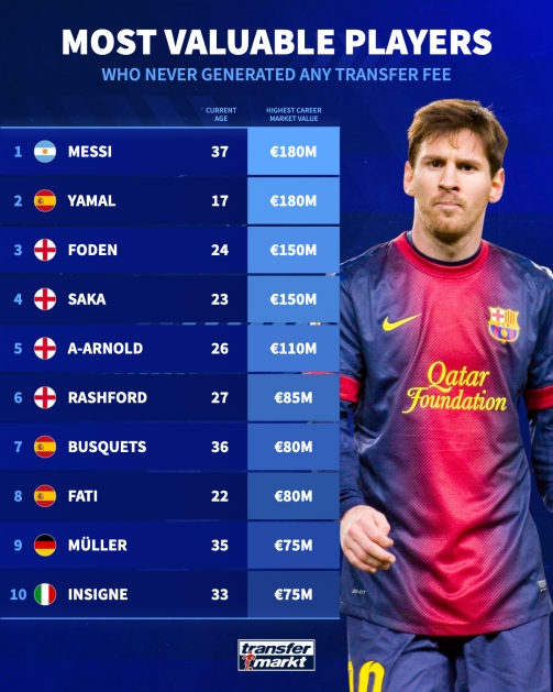 德轉(zhuǎn)盤點(diǎn)了“從未產(chǎn)生轉(zhuǎn)會(huì)費(fèi)的身價(jià)最高球員”,梅西當(dāng)之無愧排名第一。