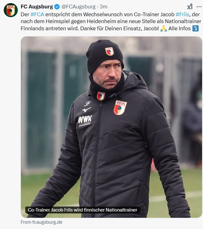 奧格斯堡官方表示,球隊(duì)助教雅各布-弗里斯收到了芬蘭足協(xié)的邀請(qǐng),以成為芬蘭國(guó)家隊(duì)的主帥。經(jīng)過(guò)討論,奧格斯堡決定放人離隊(duì),滿足弗里斯的愿望。各方同意不披露轉(zhuǎn)會(huì)費(fèi)金額。