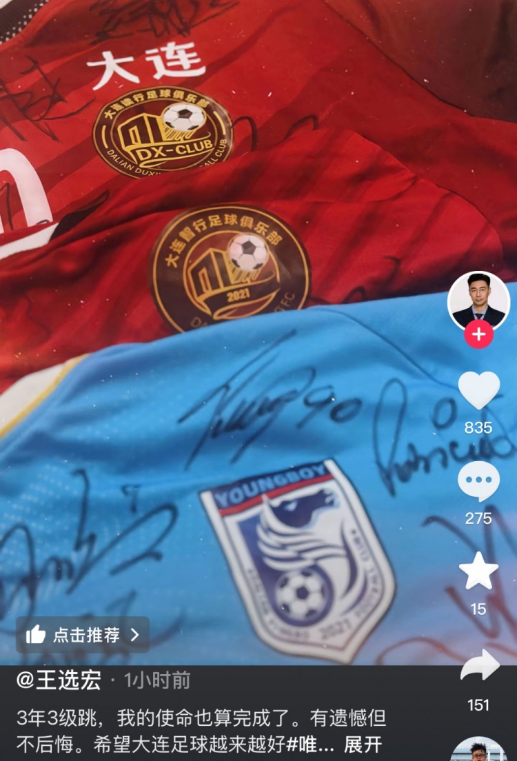 王選宏在社媒告別寫(xiě)道:“3年3級(jí)跳,我的使命也算完成了。有遺憾但不后悔。希望大連足球越來(lái)越好?!庇芯W(wǎng)友詢(xún)問(wèn)他準(zhǔn)備去哪,王選宏則回復(fù)“退了”。