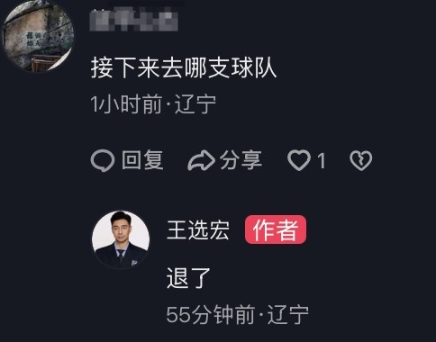 1月20日訊 今天,老將王選宏更新社媒,向大連英博告別,并宣布就此退役。