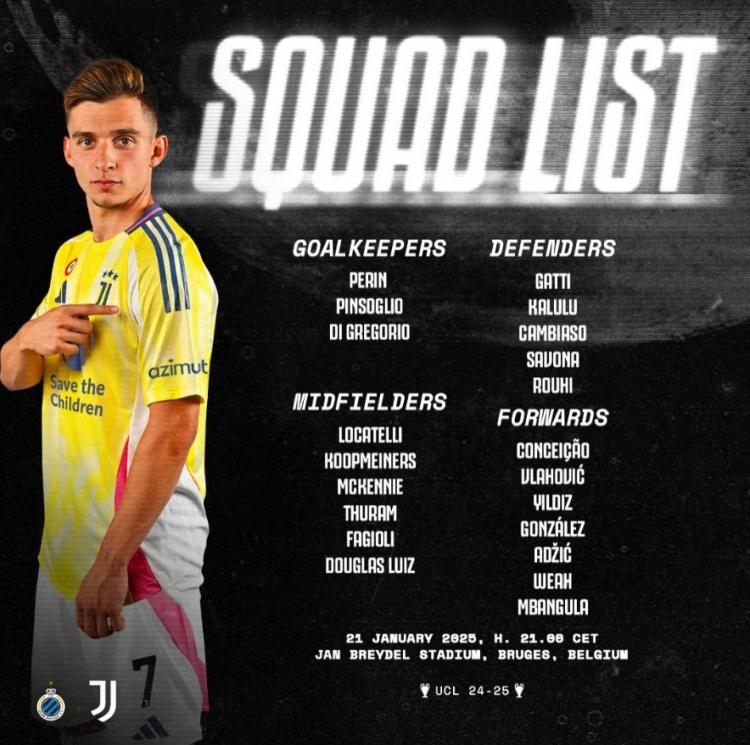1月20日訊 北京時(shí)間1月22日凌晨4:00,歐冠聯(lián)賽階段第7輪,尤文圖斯將客戰(zhàn)布魯日。賽前,尤文官方公布了本場比賽球隊(duì)大名單,弗拉霍維奇領(lǐng)銜鋒線,小孔塞桑在列。