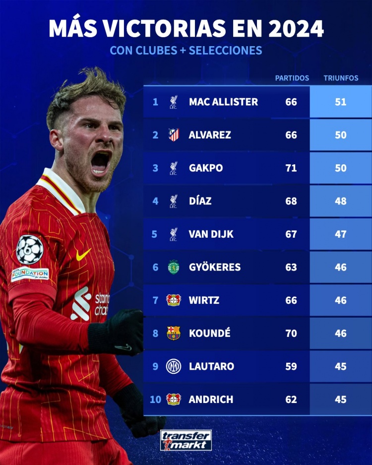 1月3日訊 德國轉(zhuǎn)會(huì)市場(chǎng)統(tǒng)計(jì)了2024年球員在俱樂部和國家隊(duì)的取勝場(chǎng)次,并列出2024年球員勝場(chǎng)排名,麥卡利斯特51勝居首,阿爾瓦雷斯、加克波50勝次席。