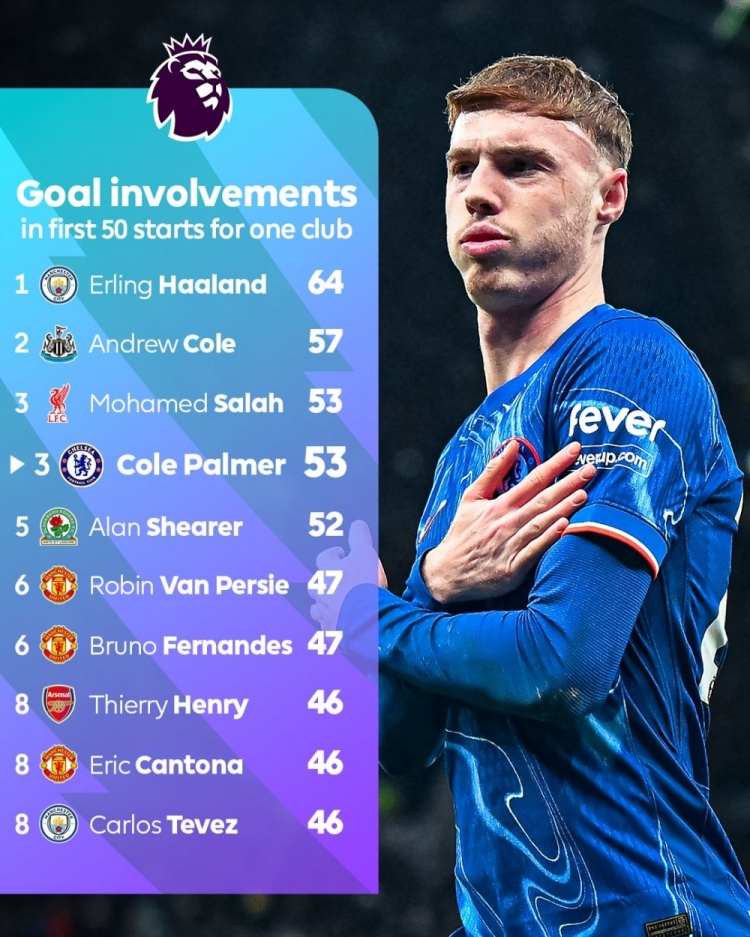 1月21日訊 英超官方統(tǒng)計了效力單一球隊前50場英超首發(fā)制造進(jìn)球榜單,帕爾默為切爾西制造53球并列第三。