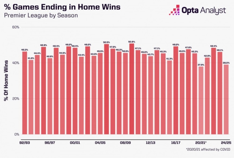 本賽季英超的主隊(duì)勝率39.0%,這是英超所有賽季中第二低的,也是有球迷在看臺(tái)上觀看比賽的最低數(shù)據(jù)。
