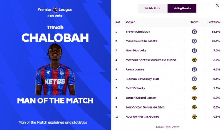 賽后英超官方宣布,查洛巴獲得了55.5%得票率,當(dāng)選全場(chǎng)最佳球員。庫(kù)庫(kù)雷利亞獲得20.6%得票率,排名第二。
