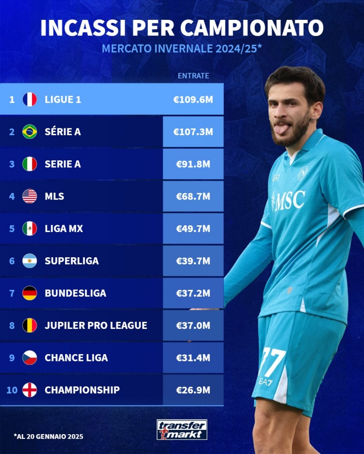 目前冬窗聯(lián)賽轉(zhuǎn)會(huì)收入排名(截止1月20日):