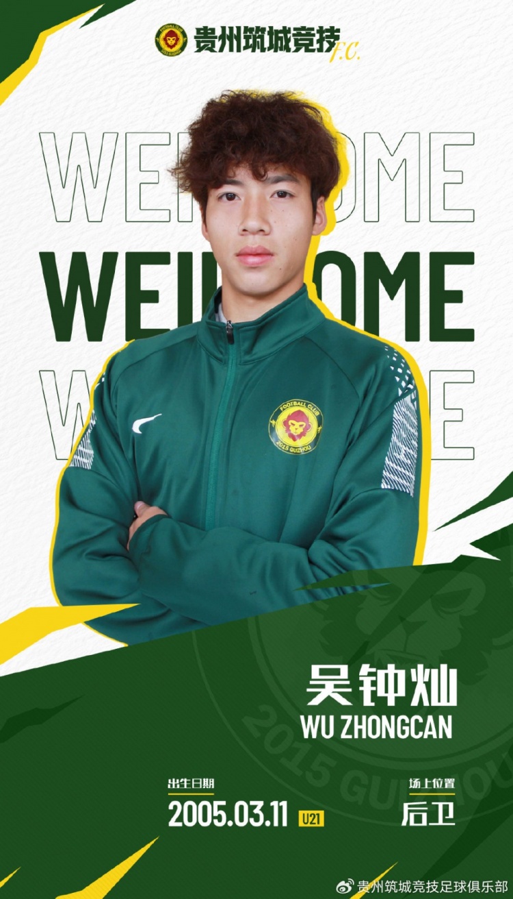 歡迎吳鐘燦加入貴州筑城競技大家庭,讓我們一起凝心聚力,一起為貴州而戰(zhàn)!