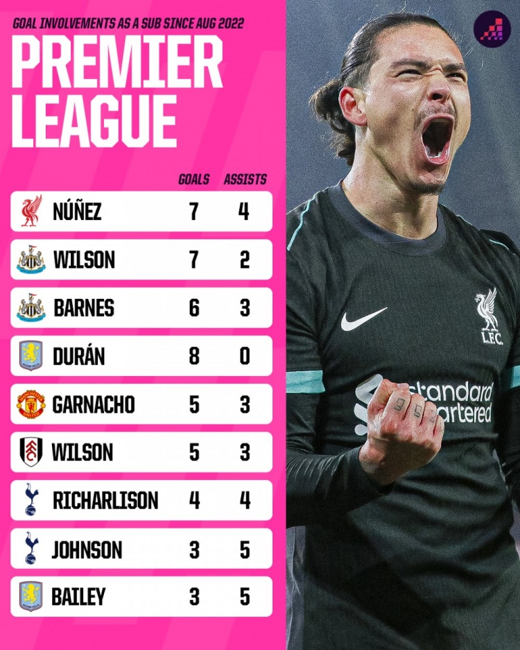 據Opta統(tǒng)計,努涅斯2022-2023賽季以來聯(lián)賽替補出場參與11粒進球,英超球員同期最多。