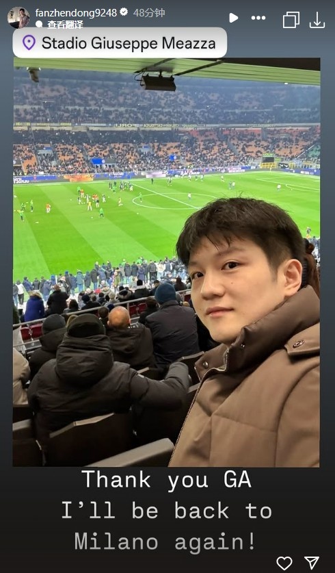 樊振東曬出來到梅阿查球場(chǎng)觀看國米比賽的自拍照,并且配文:謝謝GA(阿瑪尼)我會(huì)再回米蘭的!